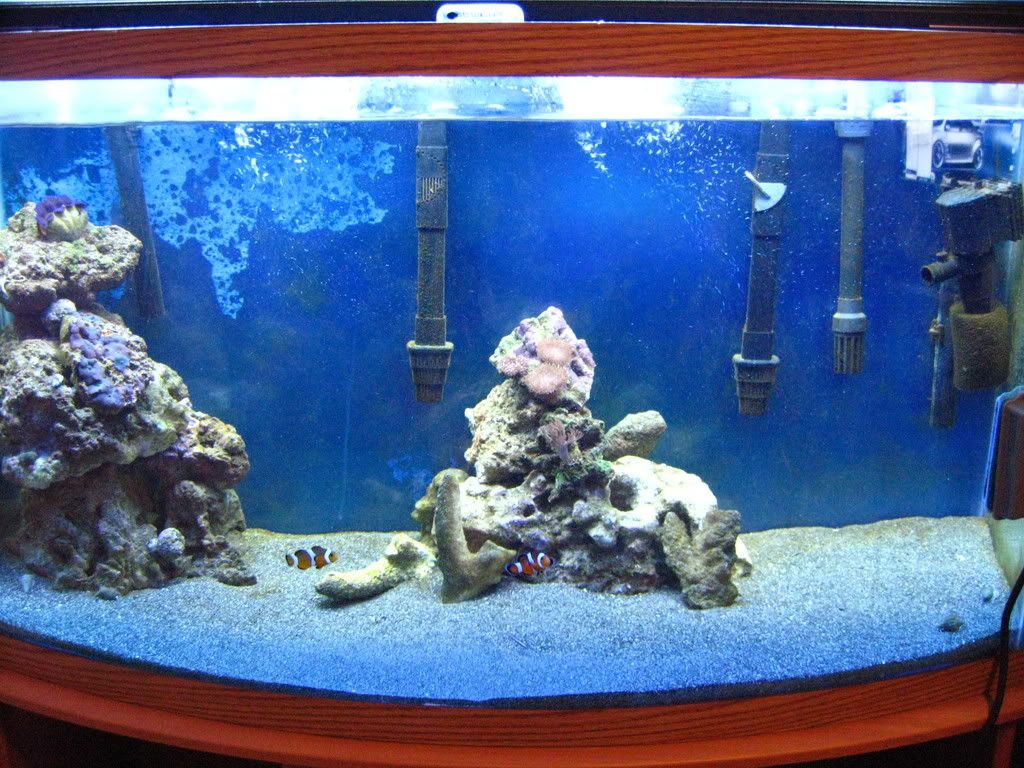 The route I went was a Drilled 40 Breeder with cal flow (thanks to ace) leading to a 20 high sump.. MH, Coral Life Skimmer, Mag 7 return pump, about 30 lbs of live rock in sump with an emperor filter. I lost alot of good fish during to move.. :( R.I.P. Powder Blue, Green Spot Mandarin, 6 line wrasse, Scooter blenny, and Twin Spot Goby... Survived By My first 2 fish ever!---> The clowns, 2 cleaner shrimp, 2 harlequins. New friends are Blue hippo (thanks Moe), a new 6 line, and a Koran Angel...