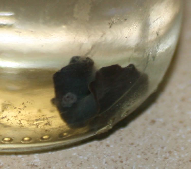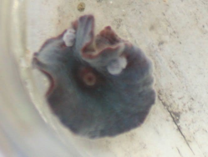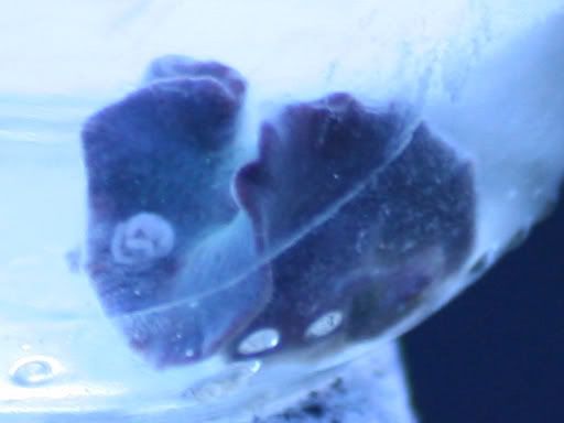 When I returned home from work I noticed it looked shriveled and droopy. I had super glued it in a shady spot, so I moved it to a better lighted area. Today when returned home from work it still looks shriveled and it has two little puffball looking spots on it. It looks like it has puked its guts out, but the puffs aren't anywhere near the mouth. My other mushrooms, palys and Xenia all look good. My monti cap is growing as well. I did have a dartfish jump Sat/Sun, but I'm not sure if it's related. I haven't had a chance to test my water yet, but I'll be doing that at my first opportunity.