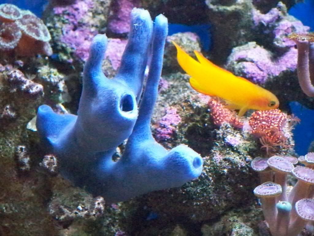 Photosynthetic blue Haliclona sponge with tiger tunicates and yellow assessor