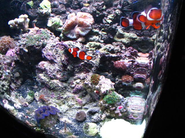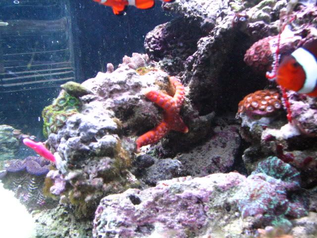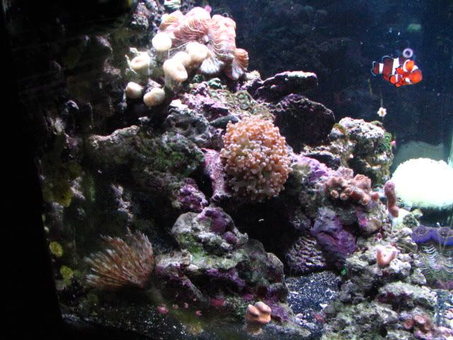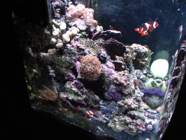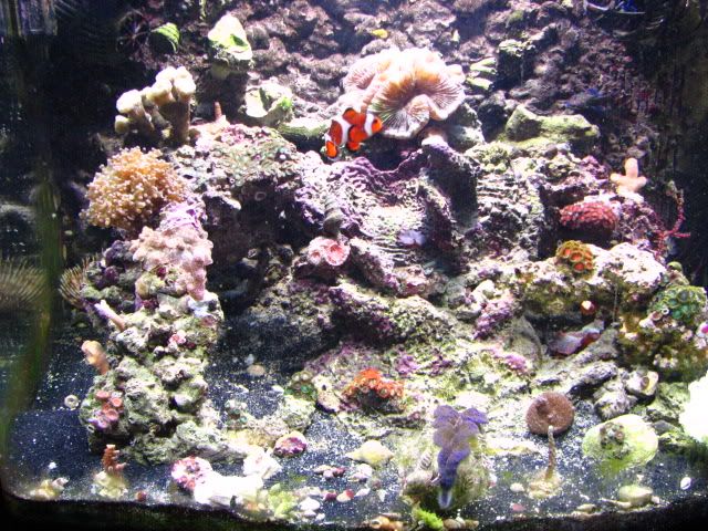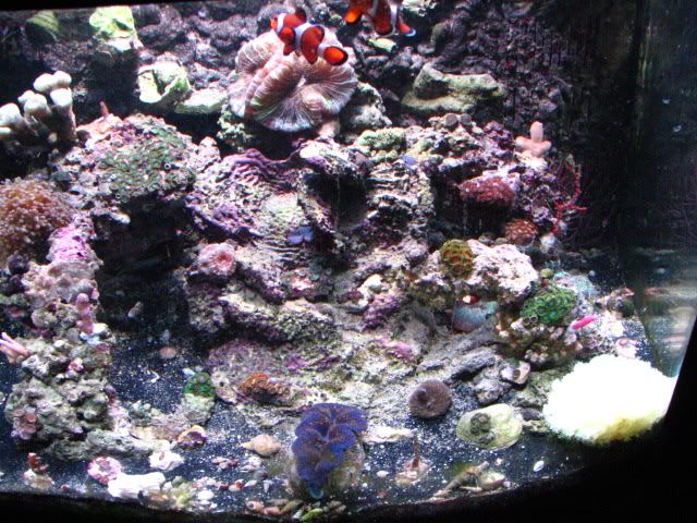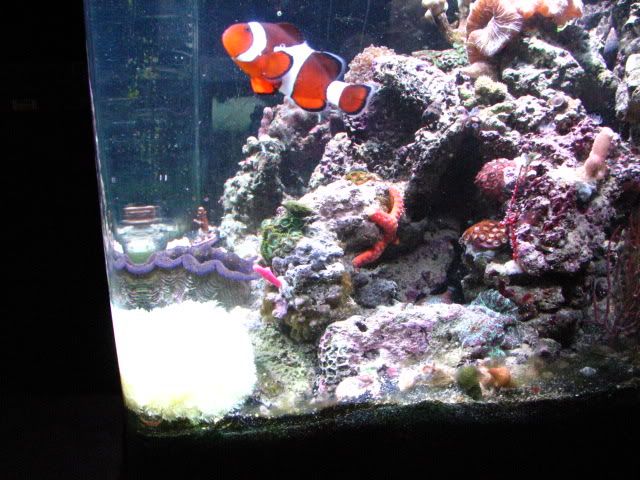 The tank is equipped with a 150 watt MH light/T5 bulb combo, as well as a Koralia 1,Koralia Nano, MaxiJet 1200 with Hydor for water flow. I have a pair of occellaris clowns, A red scooter blenny, a Mandarin Dragonet, a Pink Tile Starfish, 2 Sexy Shrimp, a crocea clam and several Blue Legged Hermits.